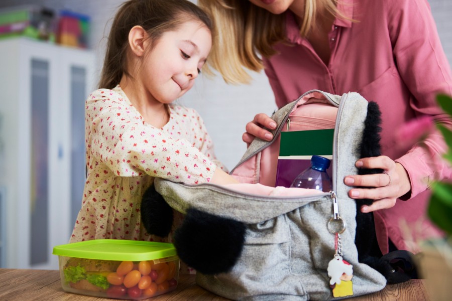 Choose lunch items your child is already familiar with and can manage themselves. Test out tricky items at home first (e.g. yoghurt pouches, banana skins, wrapped cheese portions) so there are no surprises on the day.