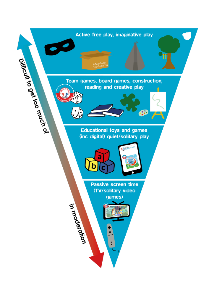 Each layer is about balance. Some forms of play, like active, imaginative, social, child-led play, are the “superfoods.” Children can never really get too much of these. Other forms, such as passive screen time, are more like the sweets and treats of a diet and should be rationed. The key is not to ban or overemphasise any one type but to make sure that across the day or week children get a healthy mix.